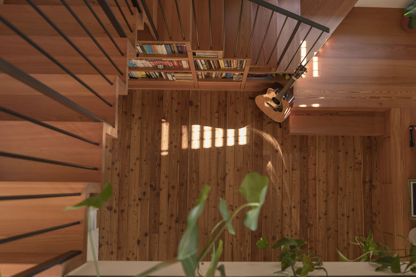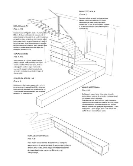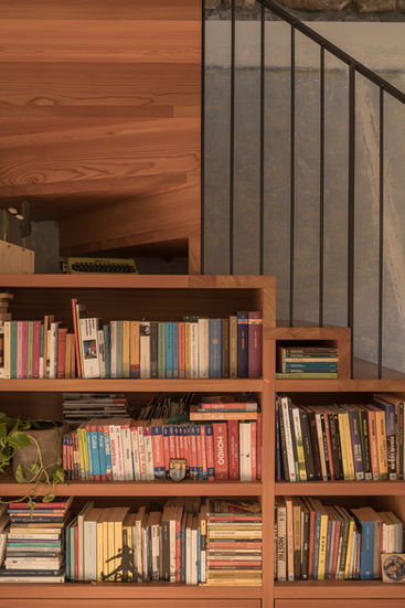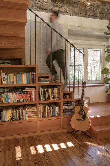 An L-shaped larch wood staircase, designed in continuity with the home’s original flooring material, connects this level to the previously unused attic, which is converted into a habitable space to accommodate the sleeping area. The staircase is conceived as a piece of furniture, incorporating shelves and storage compartments within it, and becomes the focal point of the apartment in its brightest corner.